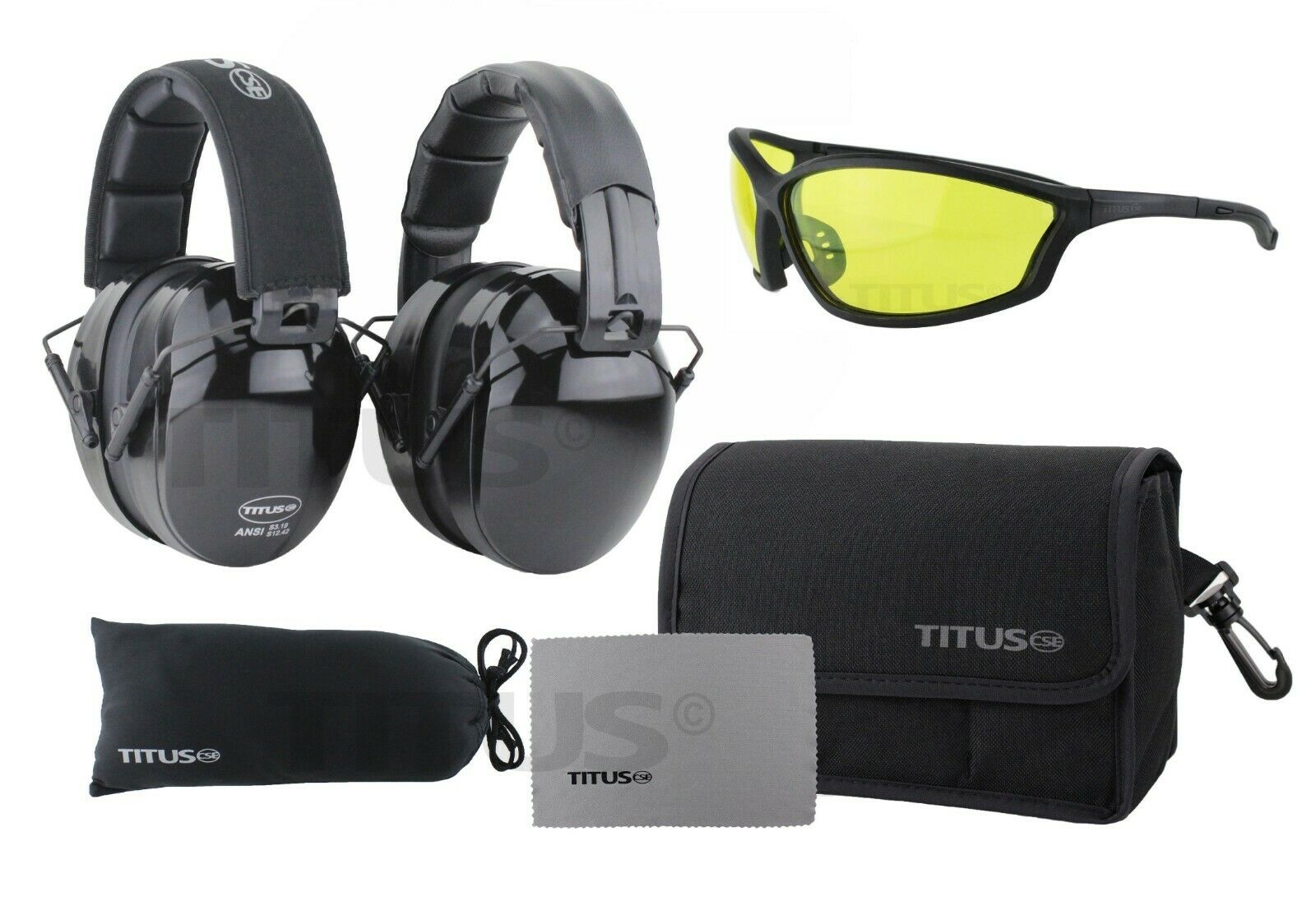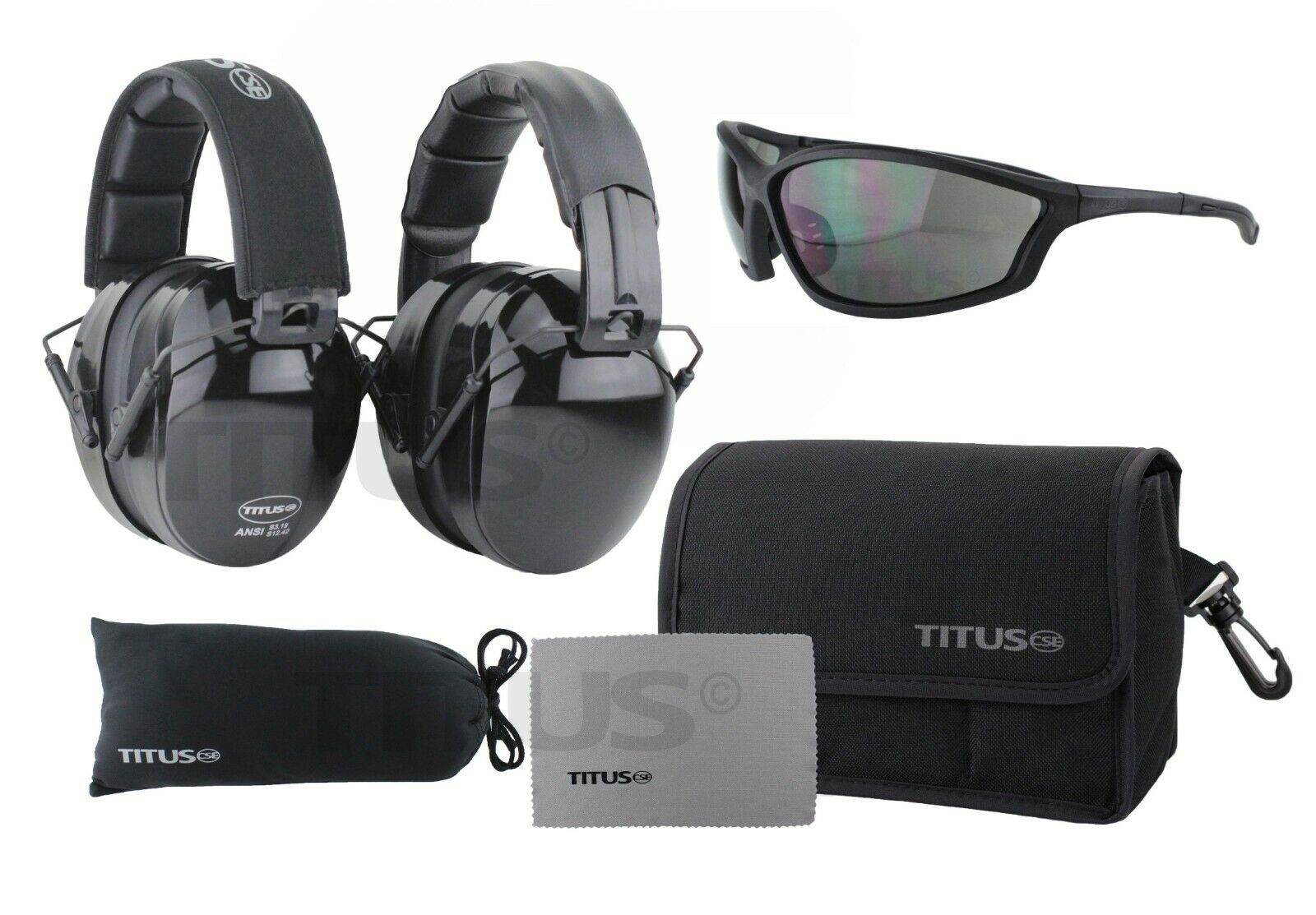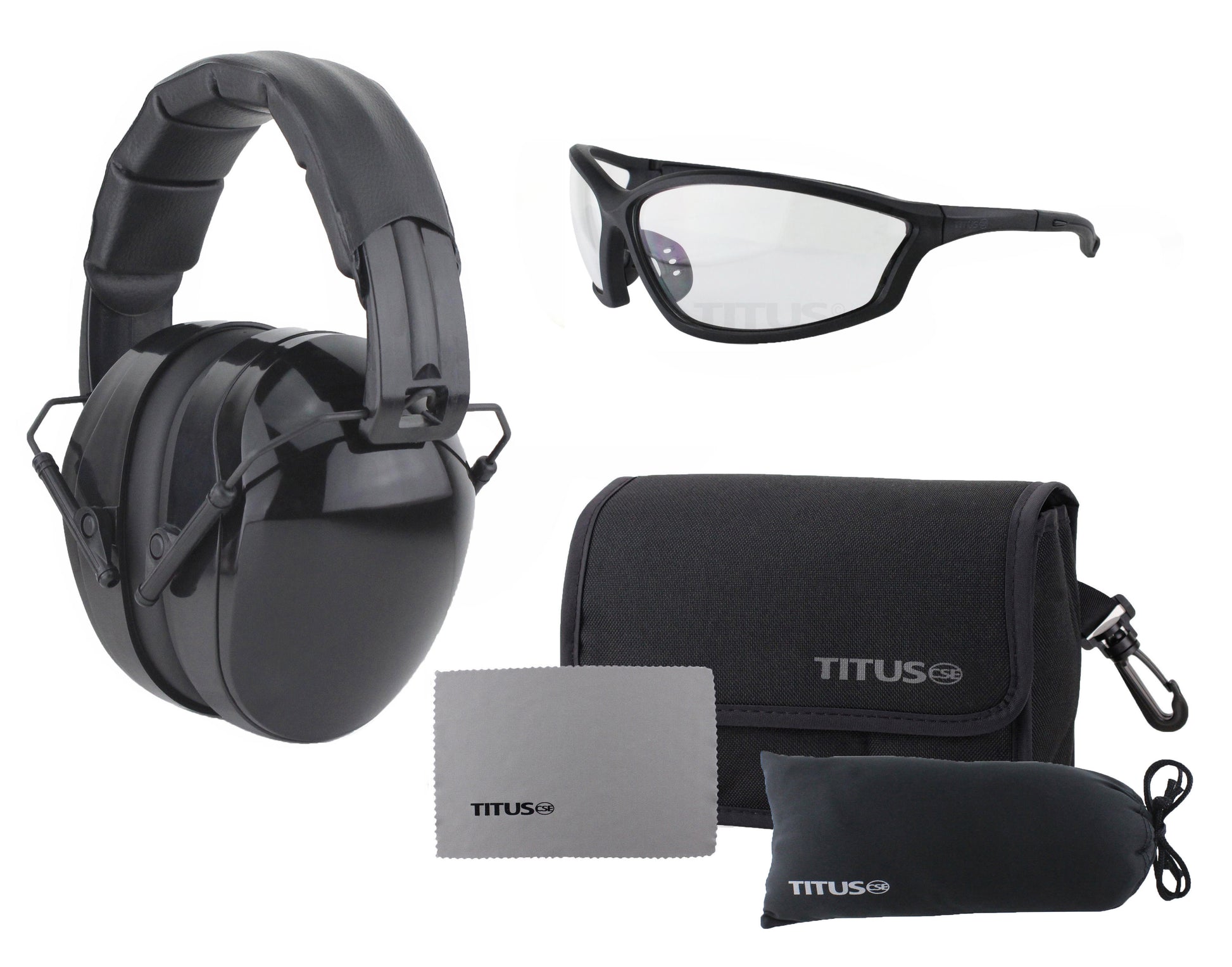 - TITUS Range Gear Bundle - Stay Organized & Keep Your Equipment Clean and Safe! Industrial Quality, Ready for Construction, Shooting, Hunting, Industrial Work, or even Heavy Machinery. Includes: Earmuffs, Range Glasses, Microfiber Glasses Pouch & Fitted Dual Compartment Storage Case.